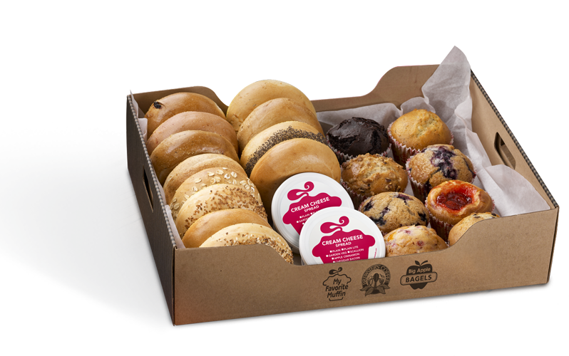 12 bagels, two 1/2 lbs. cream cheese, 8 jumbo muffins in an easy to transport box that doubles as a serving tray.